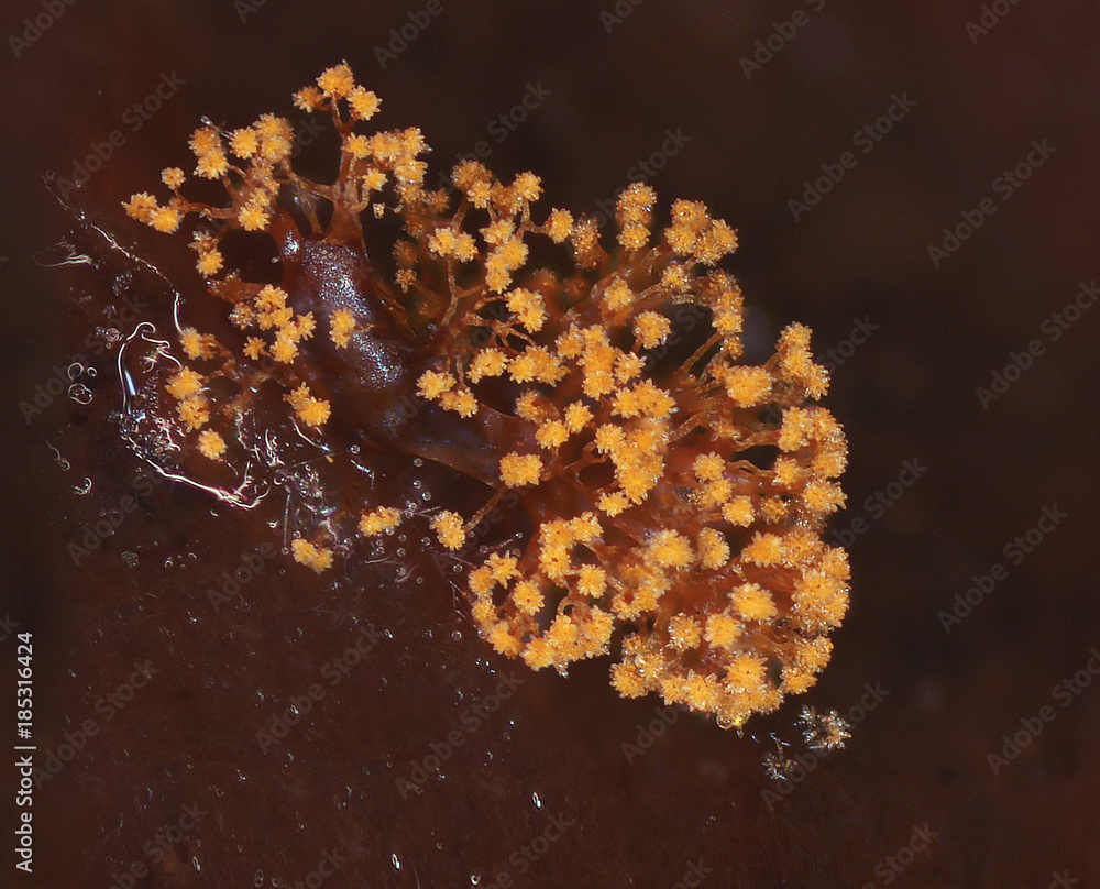 An Orange Microscoric Colony Of Myxobateria Look Like Strange Flowers Mushrooms Or Coral Polyps Myxobacteria Are Unicellular Bacteria That Gather To From A Much Large Organism Black Background Stock Photo Adobe